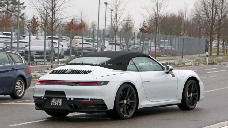 根据谍照显示,全新保时捷911敞篷版车型在外观方面采用了轻度伪装,参考此前发布的全新一代911,新车的外观风格应该也不会有太大差别。但作为敞篷车型,由于没有硬顶版车型溜背式的设计,敞篷版车型在发动机盖上方有较为明显的隆起,以提供顶棚打开后的收纳空间,这一设计与历代的911敞篷版相似。